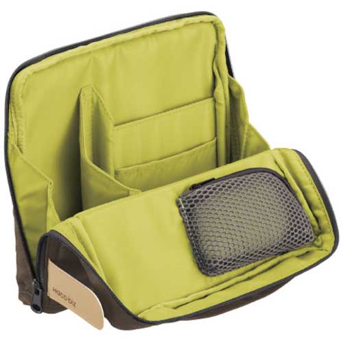 ●サイドに固定ベルトを留めると自立します。スタンド式で開口部が前方に広がり、中身が見やすく取り出しやすい。