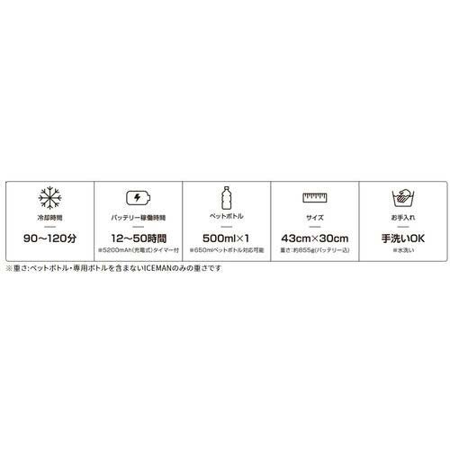●凍ったペットボトル1本での使用時間の目安は、約1時間30分〜2時間です。
