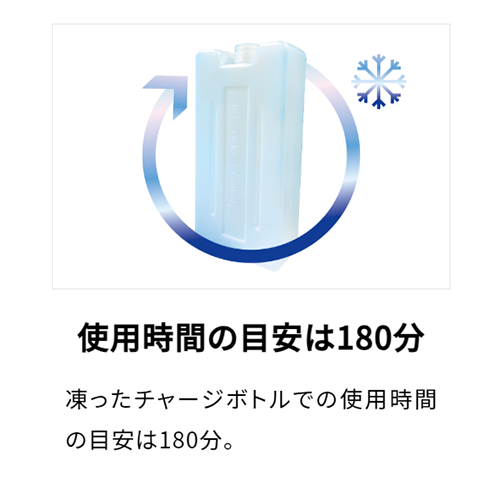 ●猛暑時でもチャージボトル1本で約2時間30分から3時間は使用可能です。