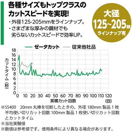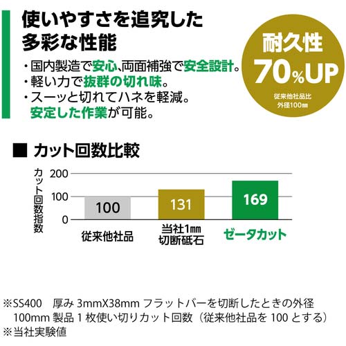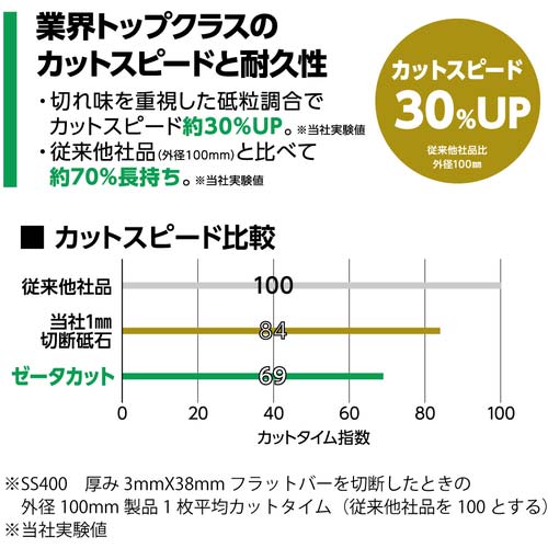 ●切れ味を重視した砥粒調合でカットスピード約30%UP、従来他社品と比べて約70%長持ちします。※外径100mm。当社実験値