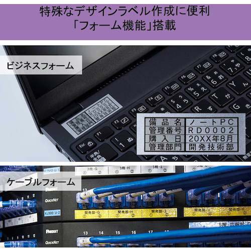●【特殊なデザインラベル作成に便利な「フォーム機能」搭載】ファイルの見出しや備品管理など、ビジネスでよく使うラベルを簡単作成できる「ビジネスフォーム」のほか、LANケーブルやネットワーク配線機器の管理表示用ラベルに特化した「ケーブルフォーム」を追加搭載しました。