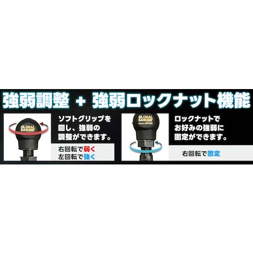 【特長】●ソフトグリップを回して強弱を調整し、ロックナットでお好みの強弱に固定できます。
