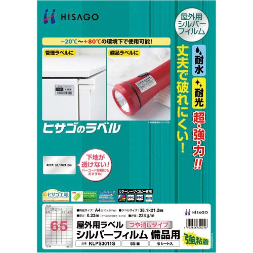 HISAGO 屋外用ラベル シルバーフィルム備品用 A4 65面 KLPS3011S