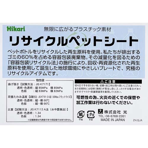 【特長】●ペットボトルのリサイクル等、再生原料を100%使用した地球環境にやさしい樹脂シートです。