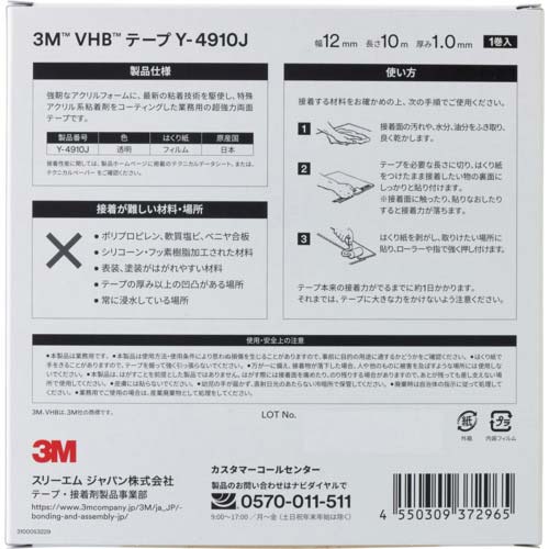 商品名 3M VHBテープ Y-4910J 12mmX10m 透明タイプ Y4910 12X10 BOX
