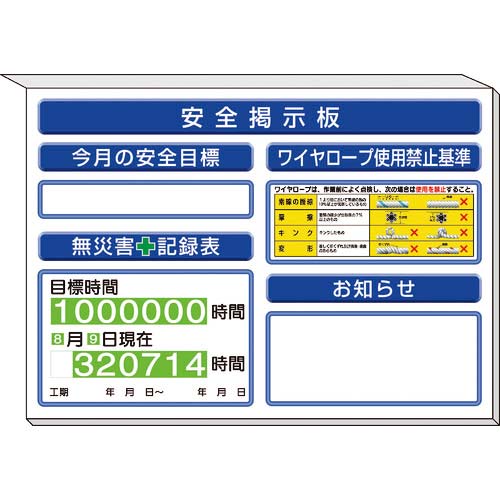 【仕様】●表示内容:安全掲示板 今月の安全目標 無災害+記録表 ワイヤロープ使用禁止基準 お知らせ