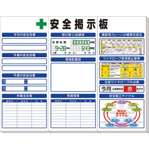 【仕様】●表示内容:+安全掲示板 今月の安全目標 今週の安全目標 今週の安全当番 作業主任者 無災害+記録表 現場配置図 有資格者 建設用クレーンの標準合図法 ワイヤロープ使用禁止基準 玉掛ワイヤロープの点検 安全施工サイクル
