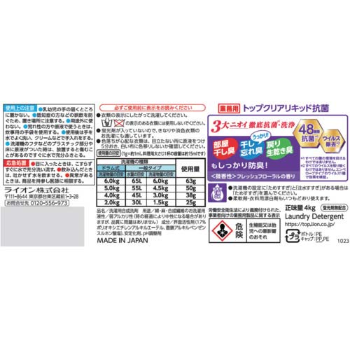 | 商品名 | ライオン トップ クリアリキッド抗菌 4kg HETAG4K |