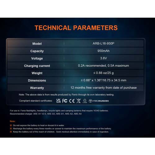 FENIX リチウムイオン専用充電電池 ARB-L16-950P