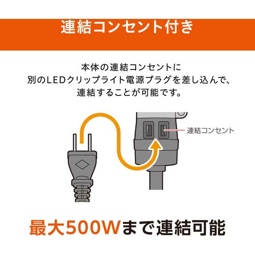 ●本体の連結コンセントに別のLEDクリップライト電源プラグを差し込んで連結することが可能です(最大500Wまで連結可能)。