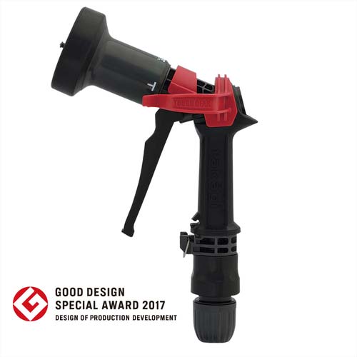 【特長】●吐水レバーを握ると連動してストッパーが自動的にロックするラクロックノズルを採用しています。