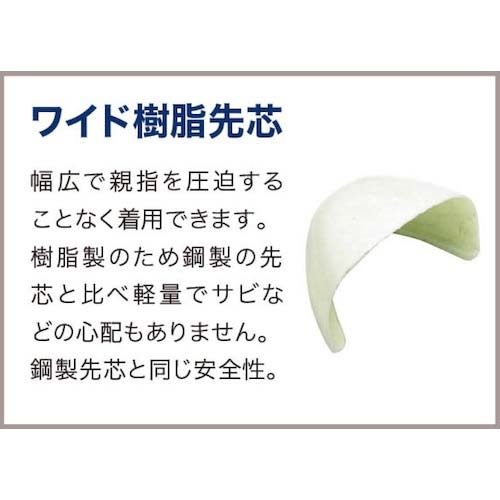 【特長】●軽量で親指を圧迫することなく着用できるワイド樹脂先芯です。
