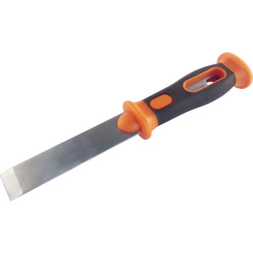●滑りにくいチェッカリングと上下にツバをつけたハンドル形状でハンマーの衝撃から手を守ります。