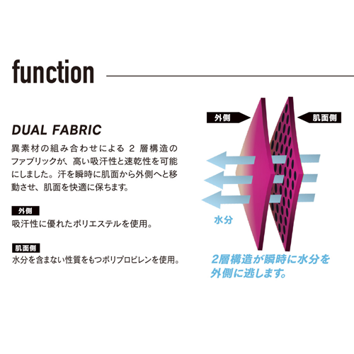 【特長】●高い吸汗速乾性能で、汗冷えやべたつきなどを軽減します。