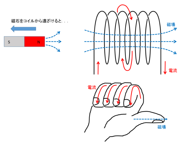 コイルのように導線が巻かれている場合は逆に考えます。コイルに電流を流した時、電流の向きを右ネジを回す方向に合わせると、ネジが進む向きがコイル内部の磁界の向きになります。コイル内では磁界が集中し、N極・S極が生じます。