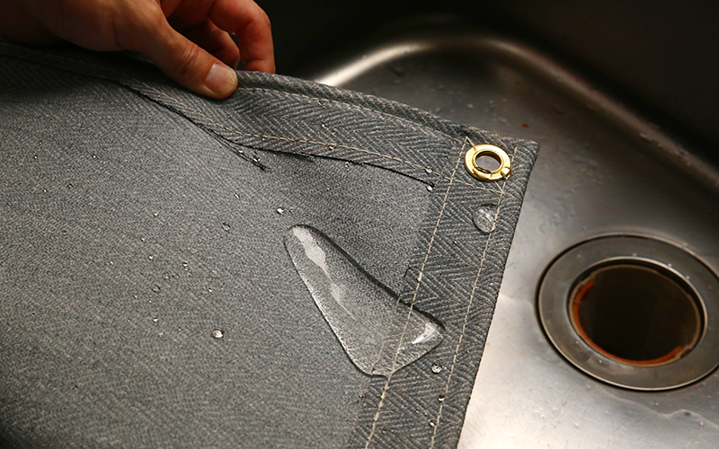 ▼コーティングのある難燃シートの場合。水をはじきますが、気持ち心もとないです。