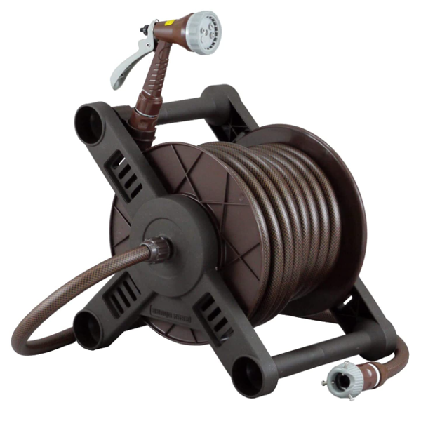 庭の雰囲気になじむ上品なブラウンカラー特徴ベトつかないホースとワンタッチで脱着可能な蛇口プラグセット、6つの水流が選べる多機能ノズル仕様ノズル/FUNノズルR、ホース/糸入り耐圧ホース、巻数/内径12mmx20m、重量/4.63kg