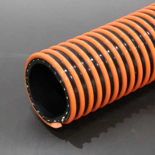 サクション(suction)とは「吸い上げ」を意味しており、負圧によりホースが潰れないよう、芯材を入れて補強がされている点がサクションホースの特徴です。材質はゴム製・樹脂製・ゴムと樹脂両方を使用したものなど様々です。工場・土木現場での吸・排水や水中ポンプの立ち上がり、急傾斜、ホースの吊り下げ状態などのシーンでよく使用されています。