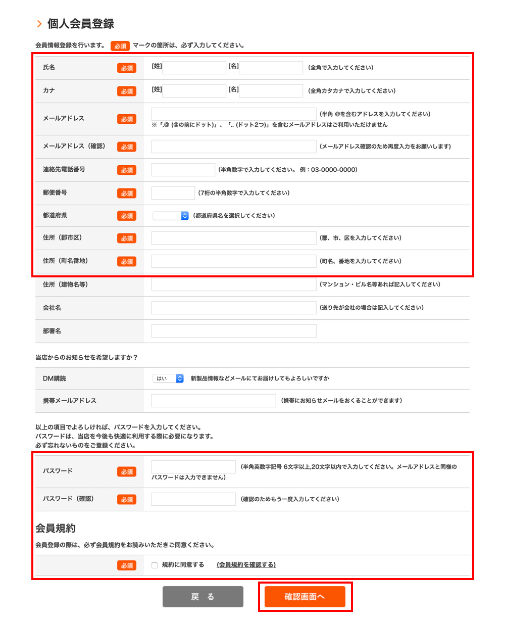 ※お名前、メールアドレス、電話番号、郵便番号、住所、パスワードは必須項目です。