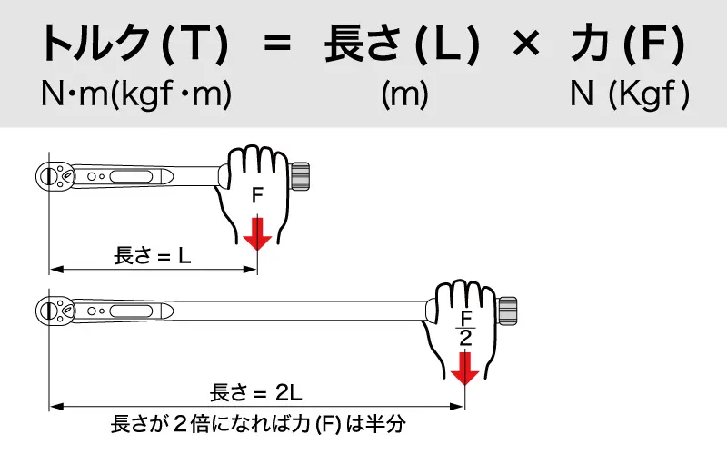 この図の通り使用する工具の長さによっても変化するので、作業品質の安定のためにもトルクが数値で分かるトルクレンチは欠かせません。