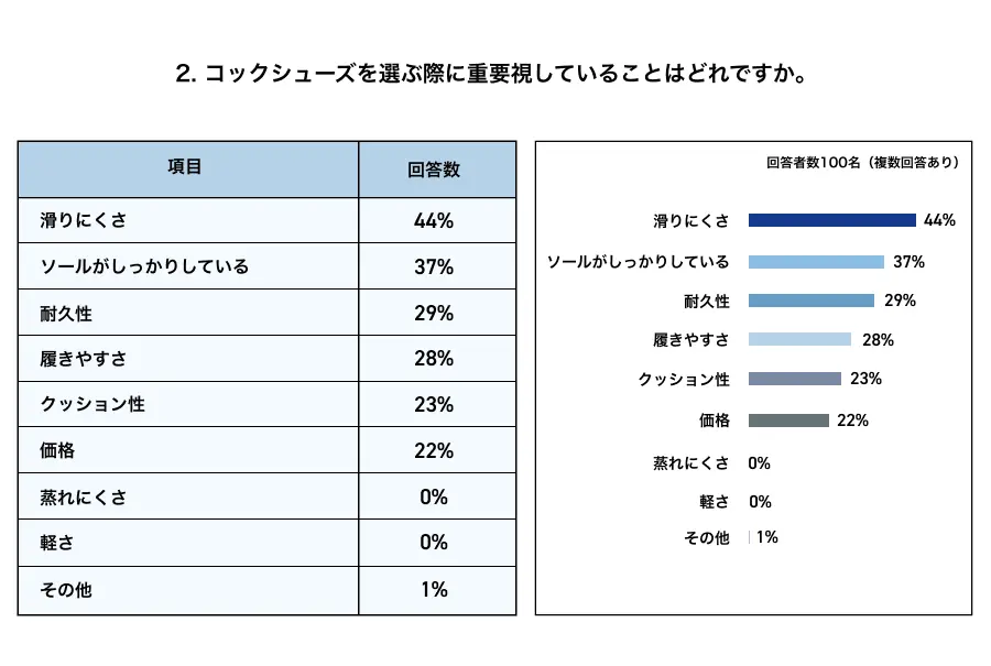 コックシューズを選ぶ際に重要視している点を100名の方にアンケートを取りました。