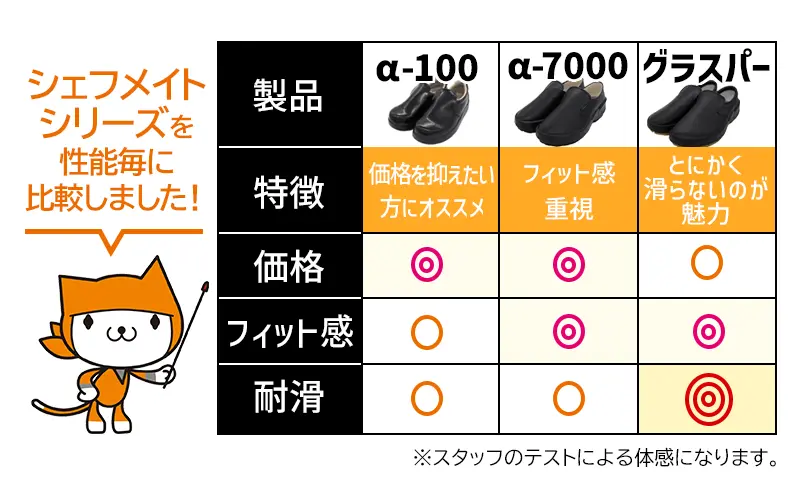 コックシューズは色んな飲食現場に合わせた種類が用意されていますので一つのブランドの中でも種類が多岐にわたります。ほんの一例としてコックシューズの定番の「シェフメイトシリーズ」の代表3種だけでもこれだけ特徴の差があります。