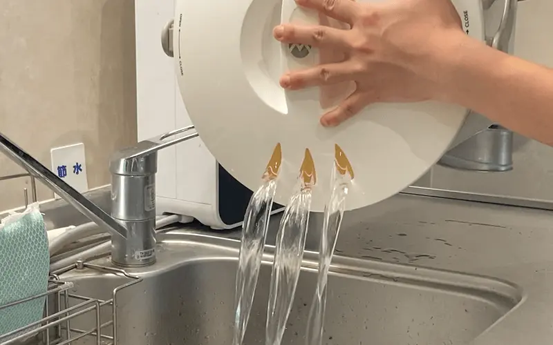 ・排水の際は上を抑えて排水したほうがいいです。中が重いと若干たわんで排水口の下から水が出て思った場所と違うところから水が出ました。あと穴が大きく勢いよく出るので最初は驚きます。慣れたら時短ができていいと思います。