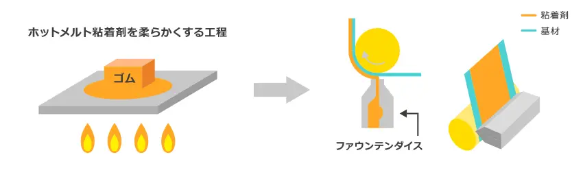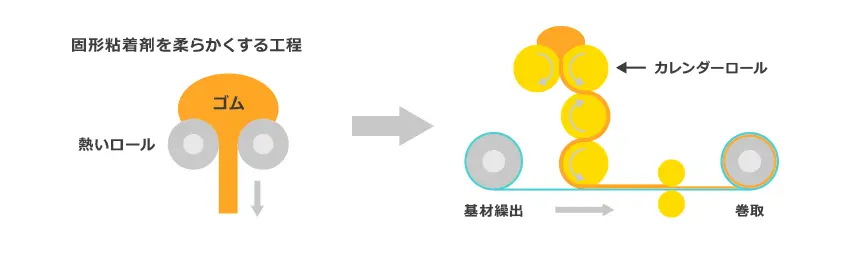 ホットメルトは粘着剤を溶かしますが、固形型は熱いロールを使って温めて柔らかくします。