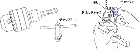 ドリルチャックは工具の種類に応じて、適切な方法で取り付けましょう。