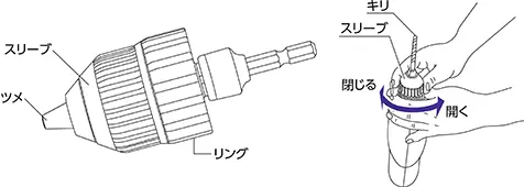 キーレスタイプのドリルチャックは、スリーブ部分を回すことでツメが開閉します。
