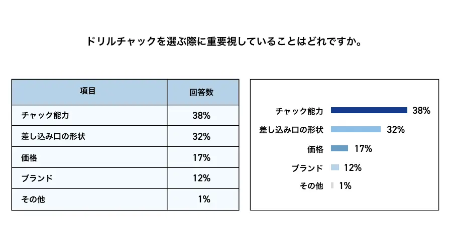 実際にドリルチャックを探している方に、ドリルチャックを選ぶ際に重要視していることをお聞きしてみた結果がこちらです。