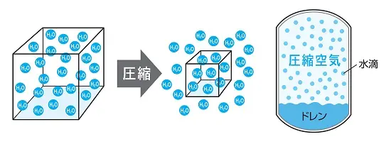 空気を圧縮するコンプレッサーは大量の空気を取り込むため、圧縮して飽和すると空気中の水蒸気は水に戻りドレンとなるのです。