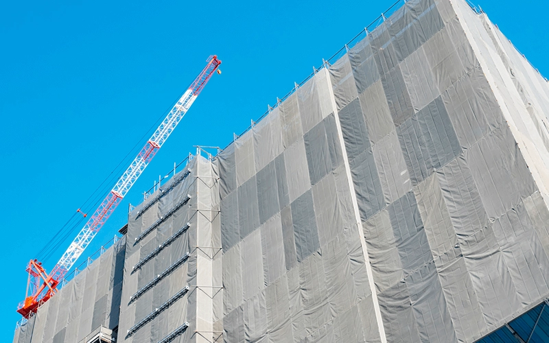 防炎シートは、建築などの工事現場の囲いや目隠しのために使われる大きなシートです。