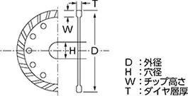 外径:105mm 内径:20mm チップ高さ:5mm ダイヤ層厚:2.2mm ダイヤ層幅:5.0mm |
