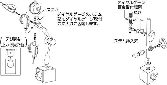 取り付け部分の穴に測定器具を差し込む際は、ダイヤルゲージのステム部分のサイズとマグネットベースの器具取付部分の穴が合っているかご確認ください。