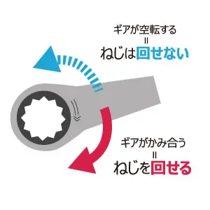 ラチェットハンドルもこの仕組みを利用しているため、ハンドルを回転させなくとも往復の力だけでもナットやボルトを締められるのです。