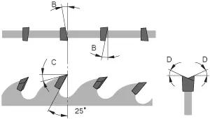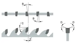 チップソーの千鳥刃とは、刃先に片刃の超硬チップが互い違いに付けられたものです。