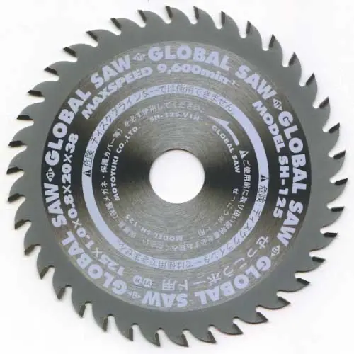 ・外径:125 mm ・刃厚:1.0 mm ・穴径:20.0 mm ・刃数:38 ・最高使用回転数:9600rpm |
