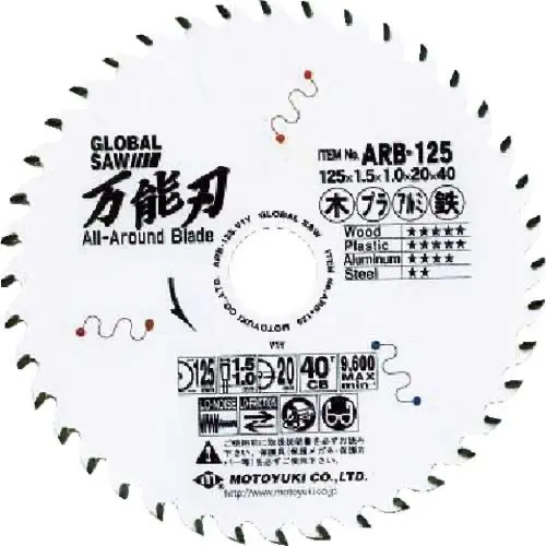 ・外径:125mm ・刃厚: 1.3mm ・穴径: 20.0mm ・刃数:28 ・最高使用回転数:9600rpm |