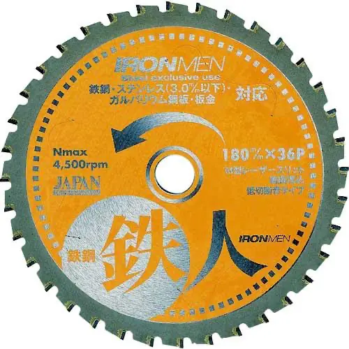 ・切断能力:鉄鋼6mm/ステンレス3mm ・外径:180 mm ・刃厚:1.8 mm ・穴径:20.0 mm ・刃数:36 ・最高使用回転数:5500rpm |