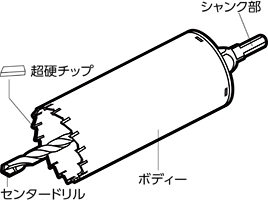 円筒状の刃物のことで、主に壁に貫通穴をあけるために使用されます。ビットの中に残った材料のことを「コア」と呼ぶのでコアドリルと呼ばれます。