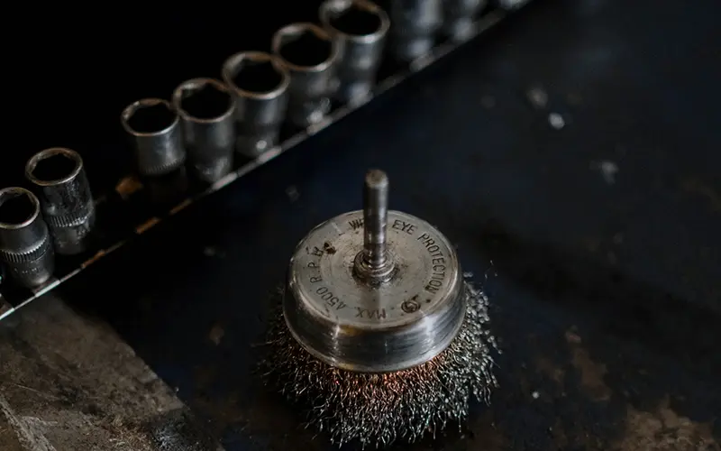 カップブラシのブラシ部分はワイヤーブラシと呼ばれる金属のものが多く使われており、このブラシが手作業に比べ素早く均等に仕上げることを可能にします。