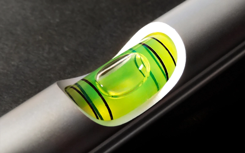 気泡で水平を示すものは「バブル水平器」と呼ばれ、気泡が真ん中にあれば水平状態を確保していることを意味します。少し真ん中から気泡がずれている場合には、床が水平ではない(=傾いている)という意味になるため、修正が必要です。
