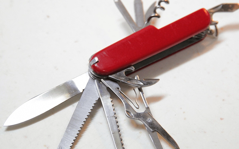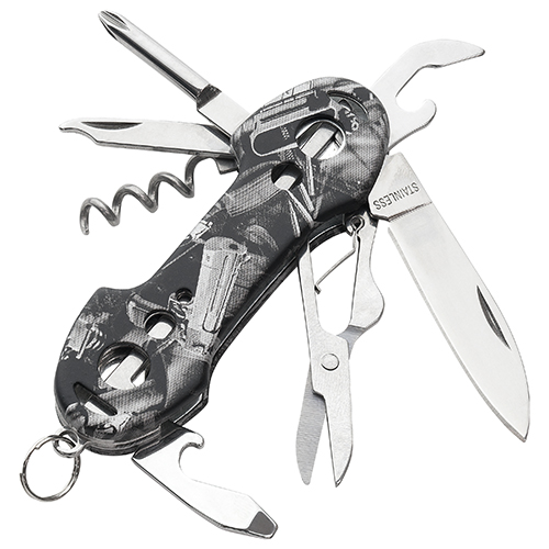 ・缶切り・ナイフ・はさみ・爪そうじ・ヤスリ・マイナスドライバー・プラスドライバー・栓抜き・コルク抜き・キーリング ・タフに使えるサビに強いステンレス製 ・幅:約26mm ・高さ:約78mm |