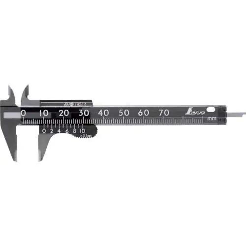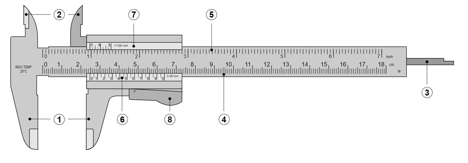 本尺につけられたmm、cm表記の目盛りです。測定したい対象物の外径または内径のサイズを測定します。