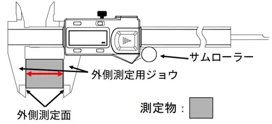 本尺、副尺の2つのジョウで対象物を挟んで外寸や外形、直径などを測定します。