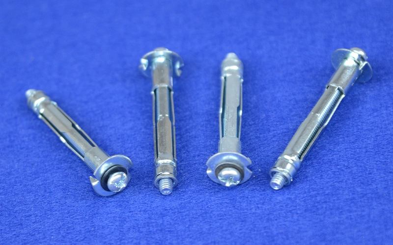 カサ式アンカーは下穴をあけてから金属製のアンカーを差し込み、ねじを締めることで裏側が広がって固定される仕組みです。